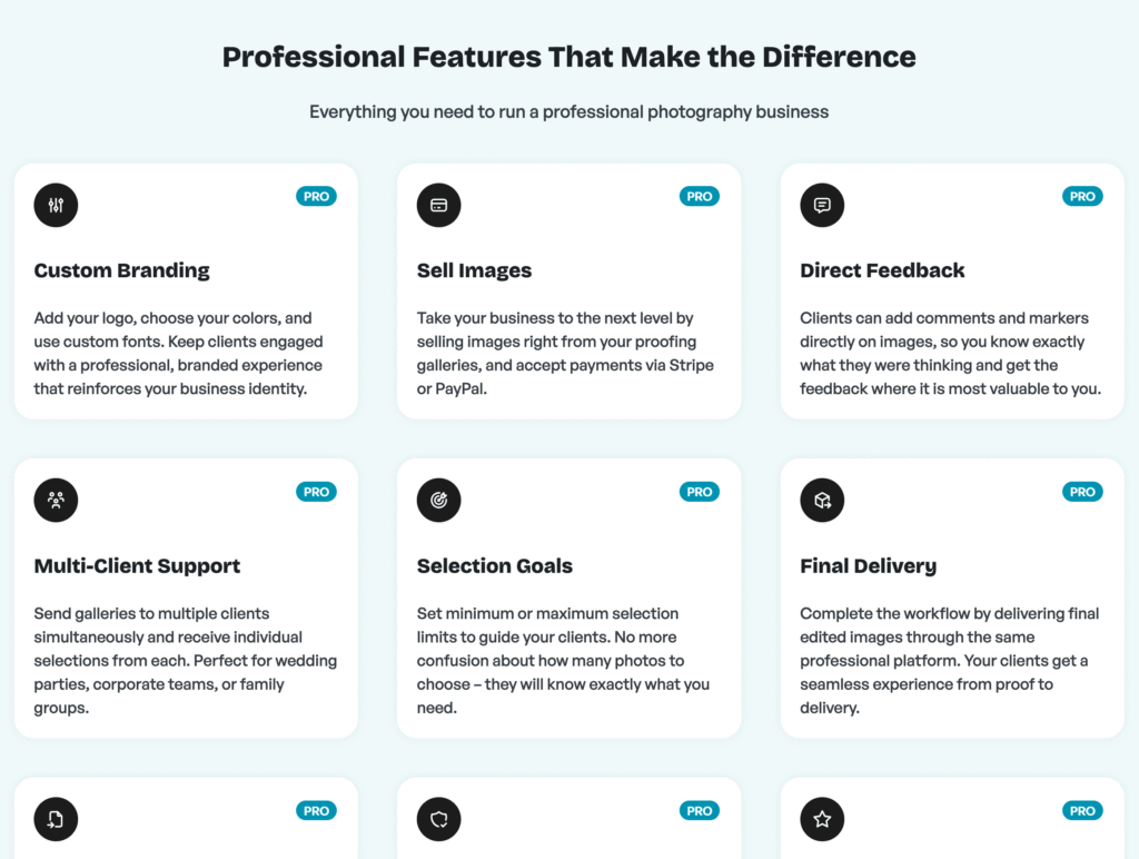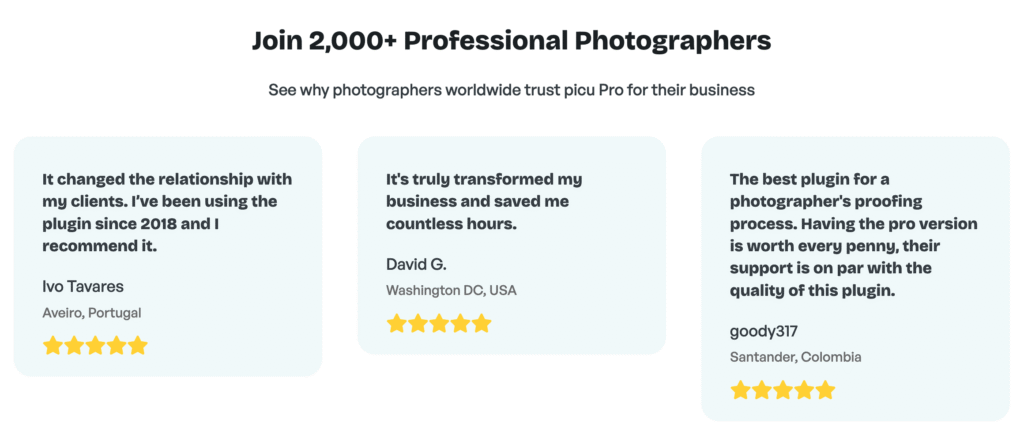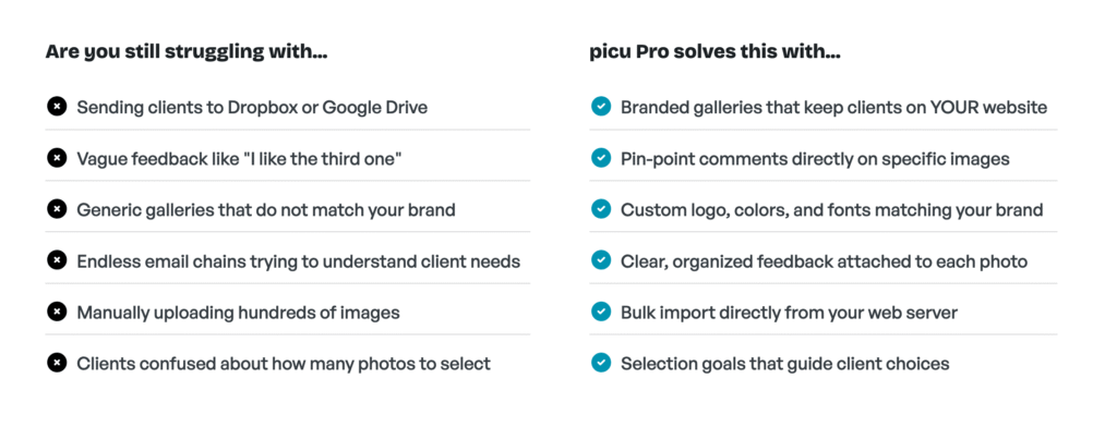 In the next section, we highlight some of the problems that picu Pro solves for photographers, as well as their solution to the right.